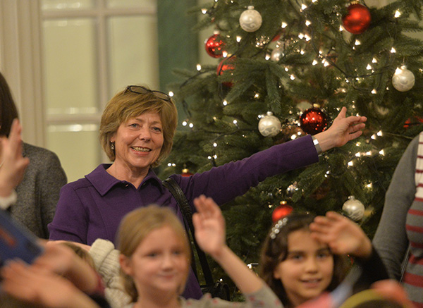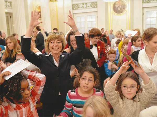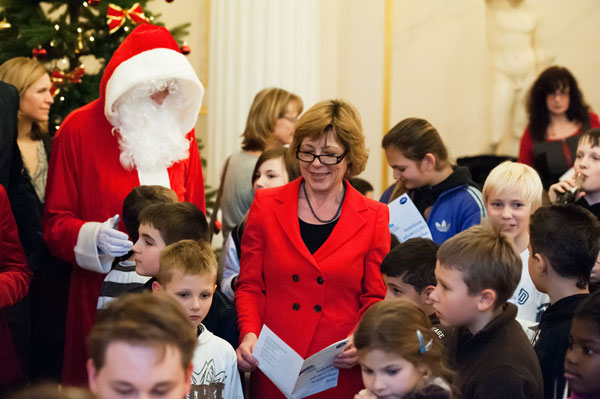Schirmherrin Daniela Schadt machte auch beim gemeinsamen Weihnachtsliedersingen begeistert mit und freute sich über die Kinderklassikgala: „Musik regt die Wahrnehmung, das Denken und die Gefühle der Menschen auf besonders intensive Weise an. Daher freut es mich als Schirmherrin der Kinderklassikgala im Konzerthaus Berlin, dass Heranwachsenden ein wunderbares Erlebnis ermöglicht wird. Ich wünsche mir besonders, dass die Kinder und Jugendlichen, die bisher keine Gelegenheit hatten, die einzigartige Welt des Theaters, der Oper oder eben eines Konzerthauses zu erleben und noch nicht mit klassischer Musik in Berührung gekommen sind, diese Welt hier mit Staunen und Freude entdecken.“